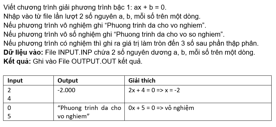 a=int(input()) b=int(input()) if a == 0: if b == 0: print("Phương trình có vô số nghiệm.") else: print("Phương trình vô nghiệm.") else: x = -b / a print("Phương trình có nghiệm x =", x)